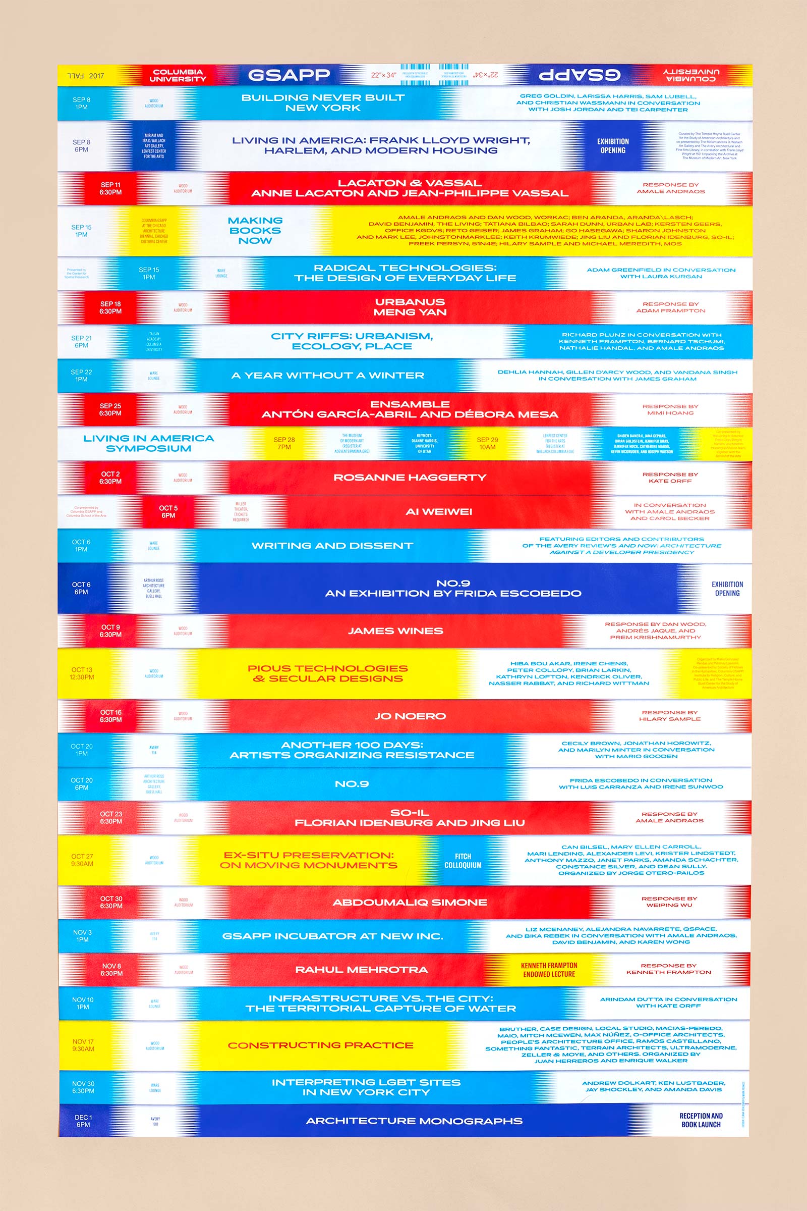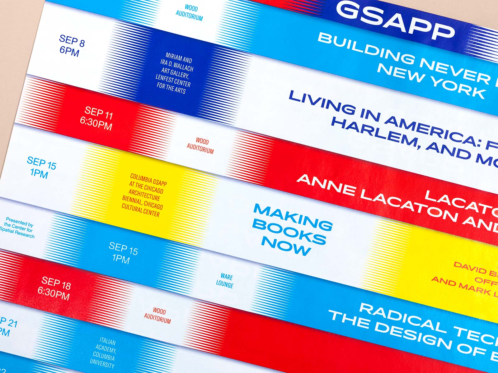 Fall 2017 poster for Columbia University Graduate School of Architecture, Planning and Preservation highlighting the program’s lectures and events each semester. Along with printed posters and envelopes, each execution also includes social media graphics, holding screens, and event flyers.