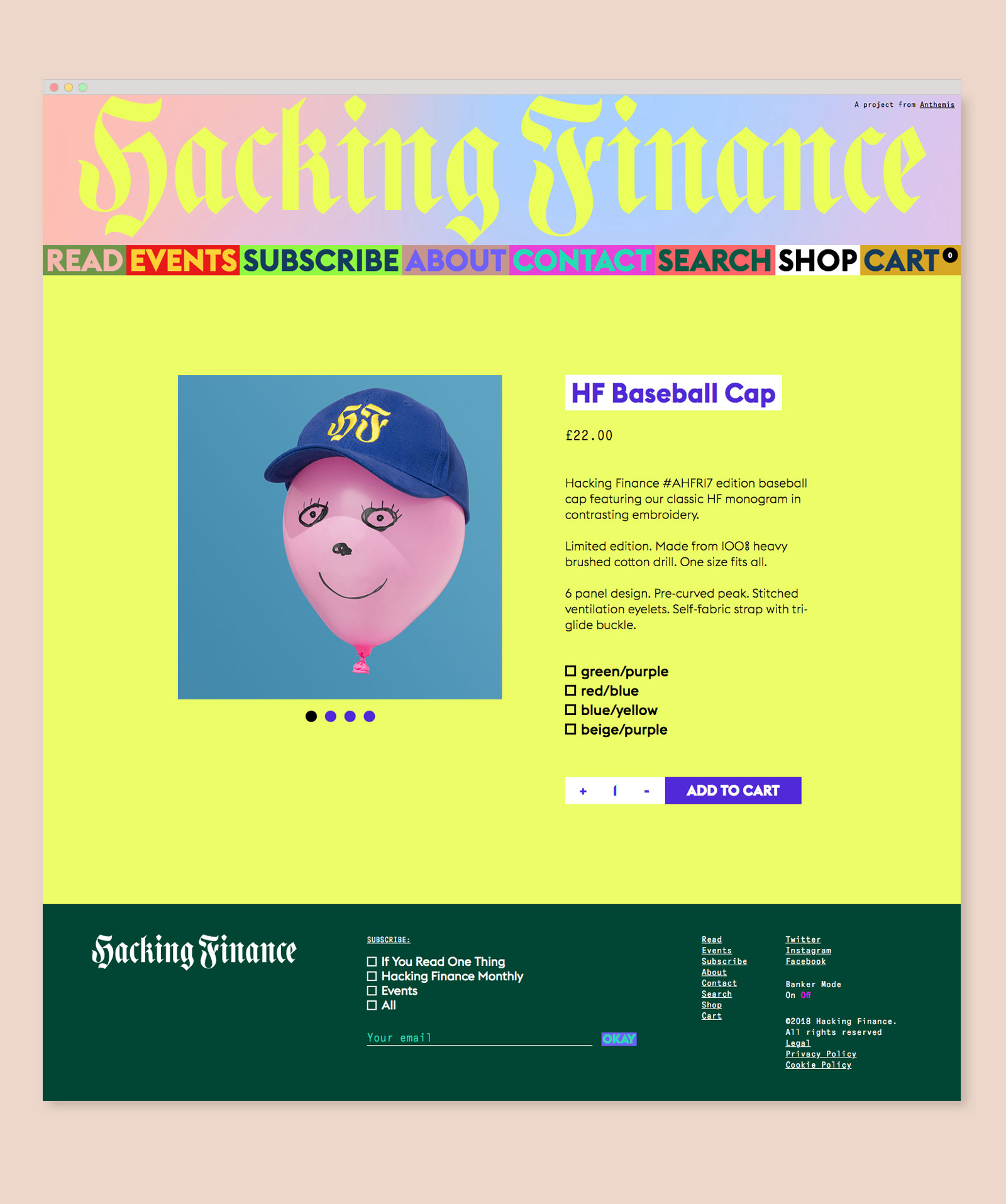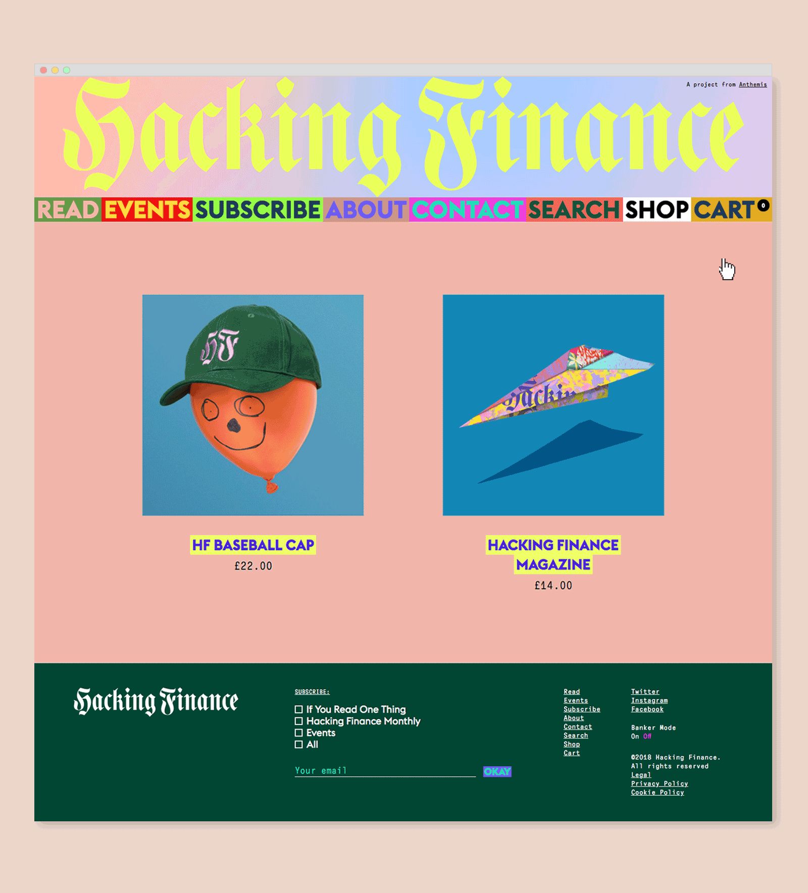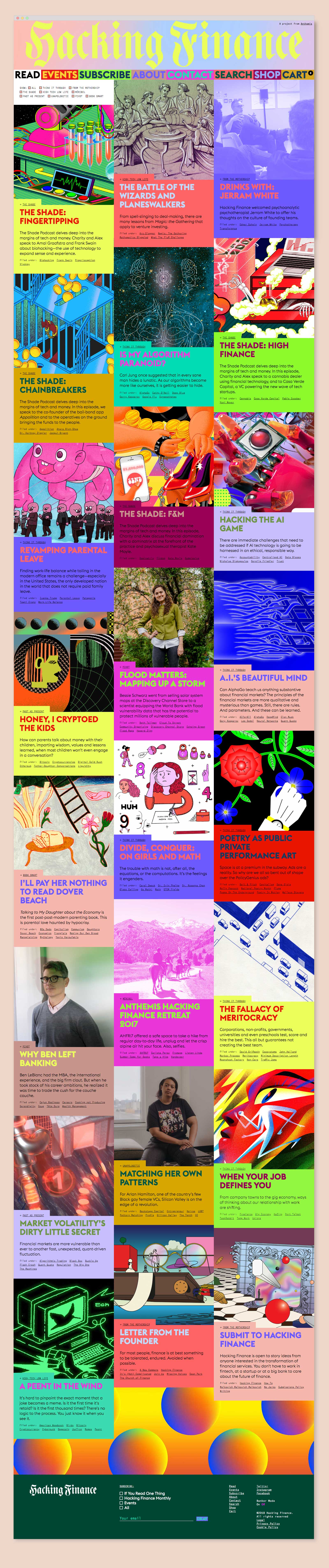 Branding, web design, and art direction for Hacking Finance, which explores the big issues impacting financial services. Responding to HF’s aim to shake up this industry, we created an expressive visual identity using a custom blackletter logotype and monogram paired with a suite of vibrant pattern and color combinations that feel wholly unexpected within the fintech space. HF’s robust online editorial platform includes a shop and even a tongue-in-cheek “Banker Mode”, which toggles to a more conservatively designed mirror of the site. In addition to art directing the site’s photography and illustration, we have also branded HF’s “The Shade” podcast, designed a print magazine, and created assets for various events, including their annual flagship retreat in Méribel, France.
