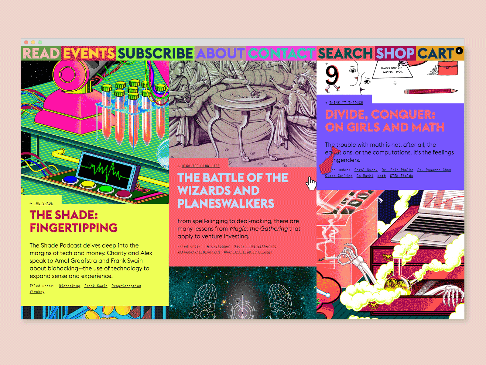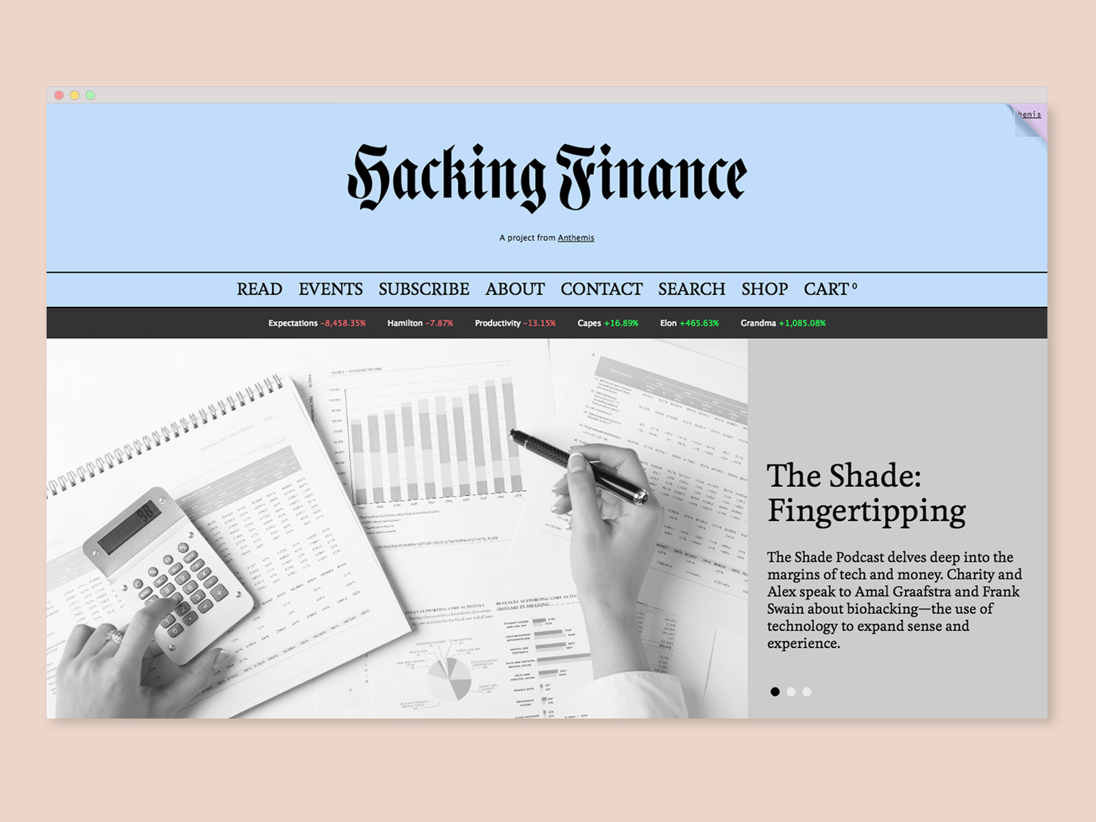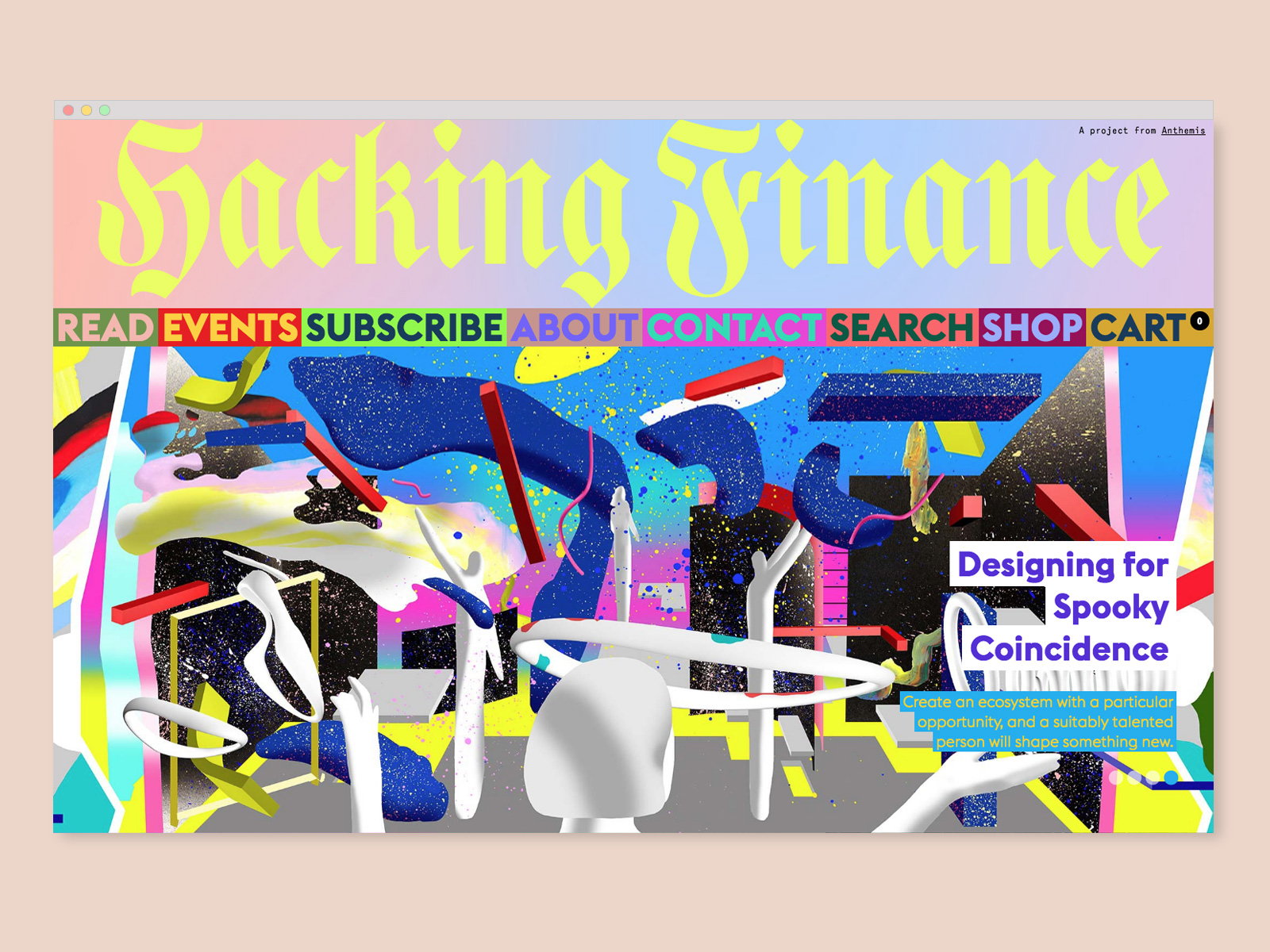 Branding, web design, and art direction for Hacking Finance, which explores the big issues impacting financial services. Responding to HF’s aim to shake up this industry, we created an expressive visual identity using a custom blackletter logotype and monogram paired with a suite of vibrant pattern and color combinations that feel wholly unexpected within the fintech space. HF’s robust online editorial platform includes a shop and even a tongue-in-cheek “Banker Mode”, which toggles to a more conservatively designed mirror of the site. In addition to art directing the site’s photography and illustration, we have also branded HF’s “The Shade” podcast, designed a print magazine, and created assets for various events, including their annual flagship retreat in Méribel, France.